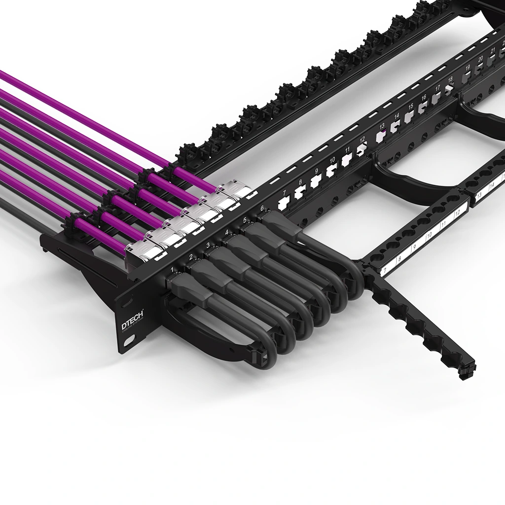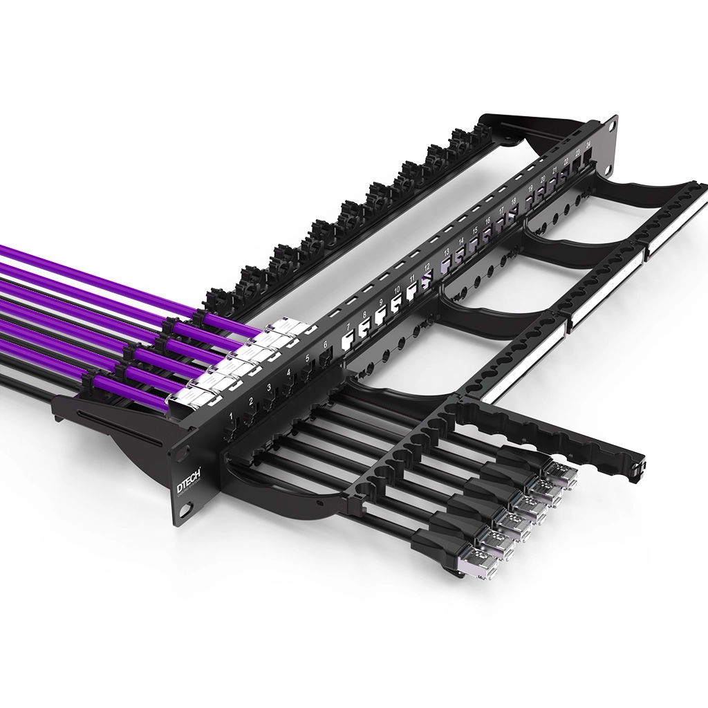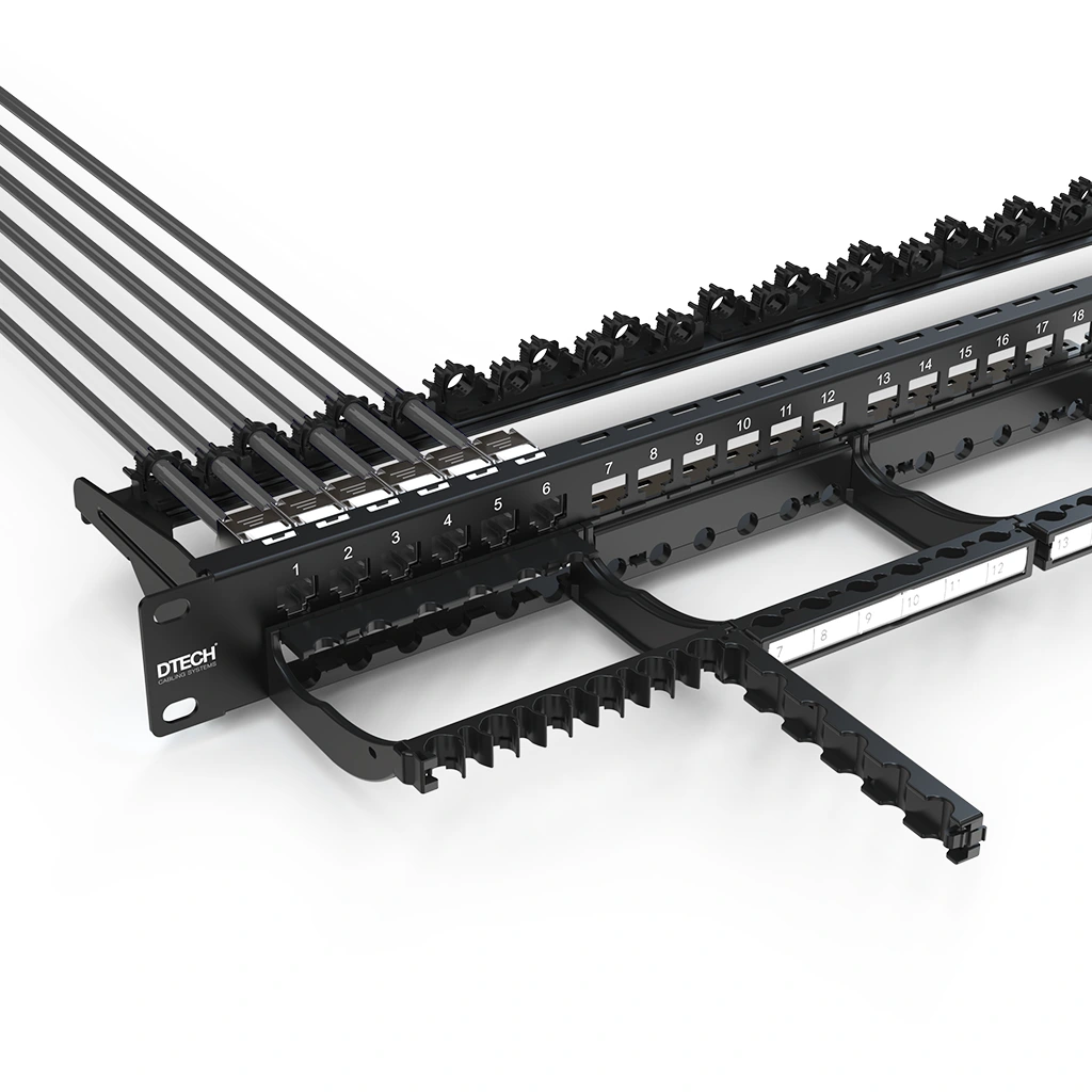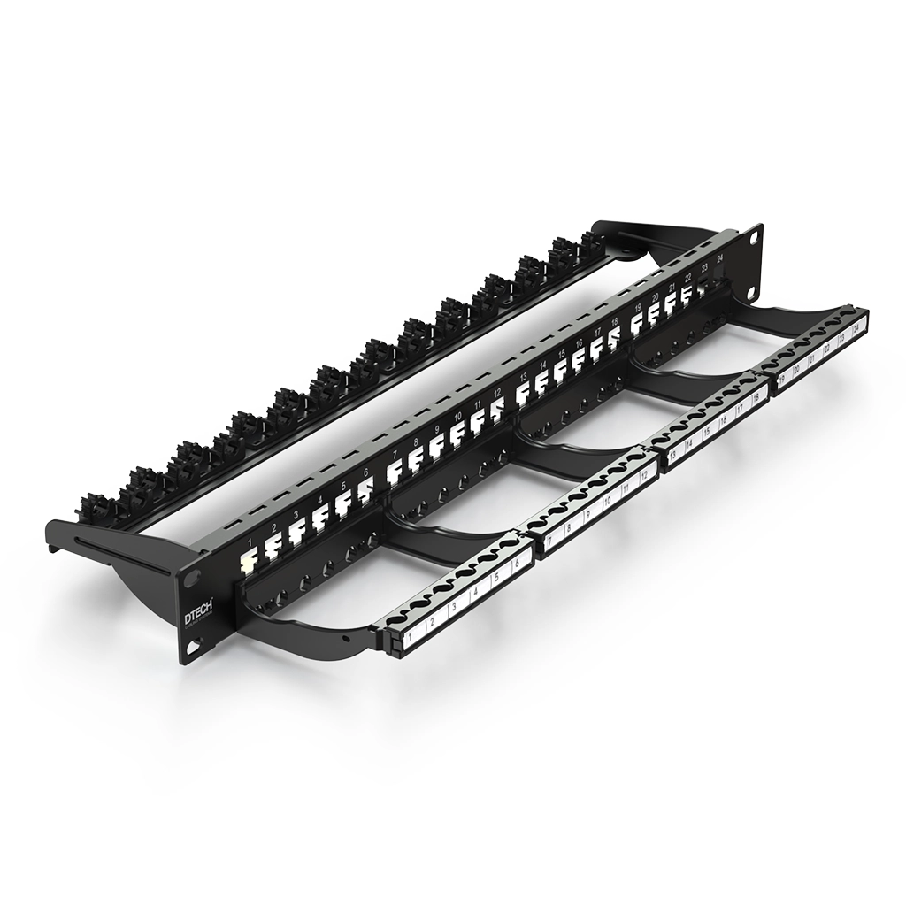 • DTECH® 24 Port 1U 19” UTP/STP keystone frame with rear quick-lock system and front cable management panel designed for flexible structured cabling installations.
